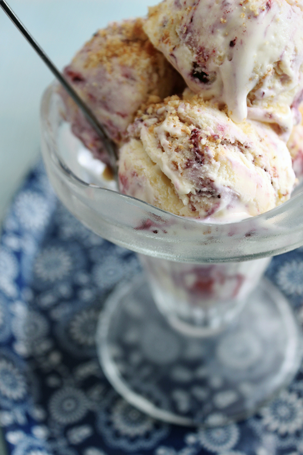 Det är alltså en glass med färskost, blåbärsrippel och bitar av digestivekex vi snackar om här. Fantastiskt gott, om jag får säga det själv. Färskosten ger en härligt krämig konsistens, och man kan faktiskt ha i färskost i vilken hemmagjord glass som helst, utan att för den sakens skull kalla det cheesecakeglass.