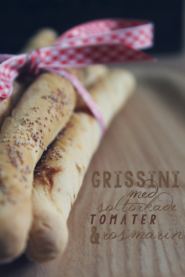 Grissini är något jag tänkt göra ett tag, och det var ju inte alls speciellt komplicerat. Degen jäser bara en gång, så de tar inte så lång tid att göra. Dessa har jag gjort med soltorkade tomater och rosmarin, men man kan variera dem på många olika sätt, varför inte prova att ha t.ex riven parmesan i?