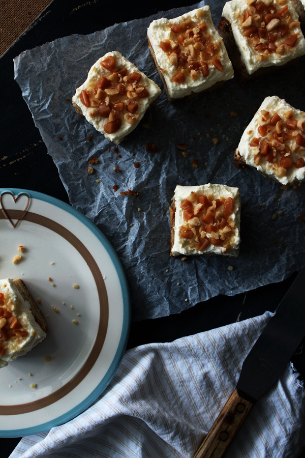 Ofta toppas kakan med grädde eller frosting för lite extra awesomeness. I detta fall har jag alltså gjort en äppelkaka, fyllt den med kolasås, och toppat med grädde och kolabitar. (Och lite hackade nötter bara för att jag är ett fan av nötter, men det är valfritt.)