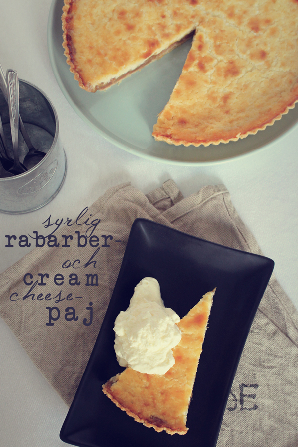 Vispa ihop alla ingredienser till färskostfyllningen. Bred ut rabarberkompotten över pajbottnen, och häll sedan på färskostfyllningen. Grädda i ca 40 minuter. Om pajen får för mycket färg, sätt en plåt över den.