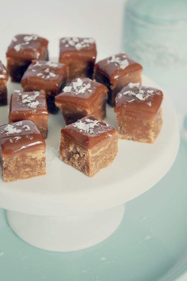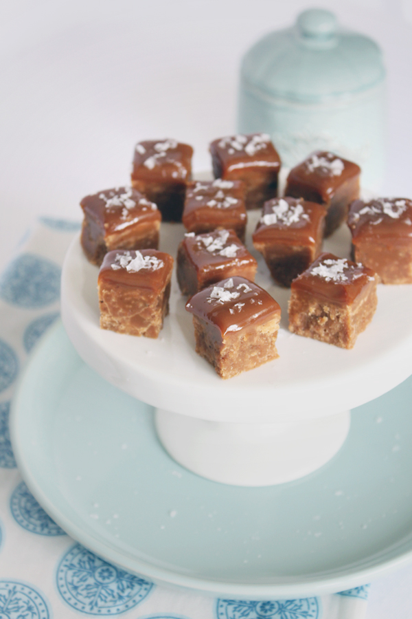 Häll smeten i formen, släta till ytan och låt den svalna något innan du ställer formen i kylen för att svalna ytterligare. Bred ut dulce de leche över fudgen innan den svalnat helt. Ställ tillbaka en stund i kylen och skär sedan i tärningar. Strö över havssalt efter smak. Förvara kallt.